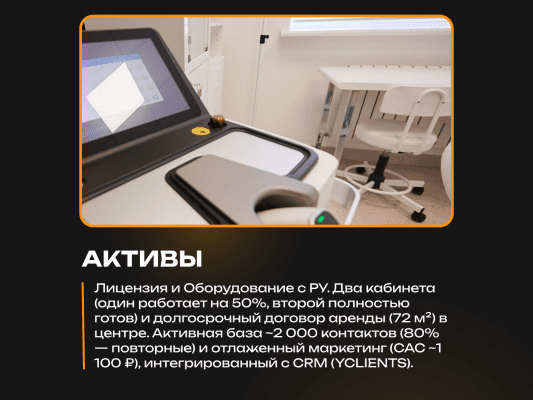 🔸 Оборудование (диодный лазер, LPG, RF/кавитация-комбайн), медмебель, стойка, IT, бренд-материалы; полный перечень — при осмотре.