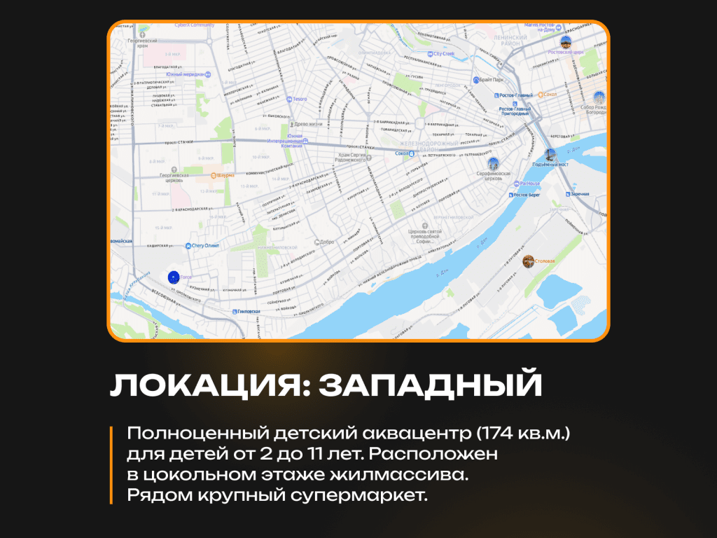 • Полноценный детский аквацентр для детей от ~2 до 11 лет, расположен в цокольном этаже жилмассива (ориентир — крупный супермаркет).
