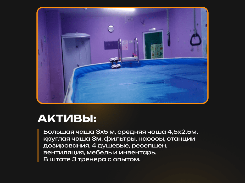 Формат — один из немногих в городе и единственный в непосредственной близости: 174 м², три бассейновые чаши, стабильный поток семей и минимальная конкуренция. Отличный готовый бизнес в сегменте детских услуг.