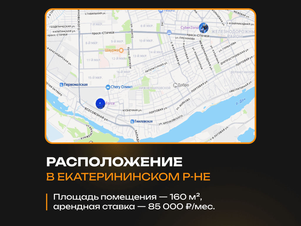 Площадь помещения — 160 м², арендная ставка — 85 000 ₽/мес.