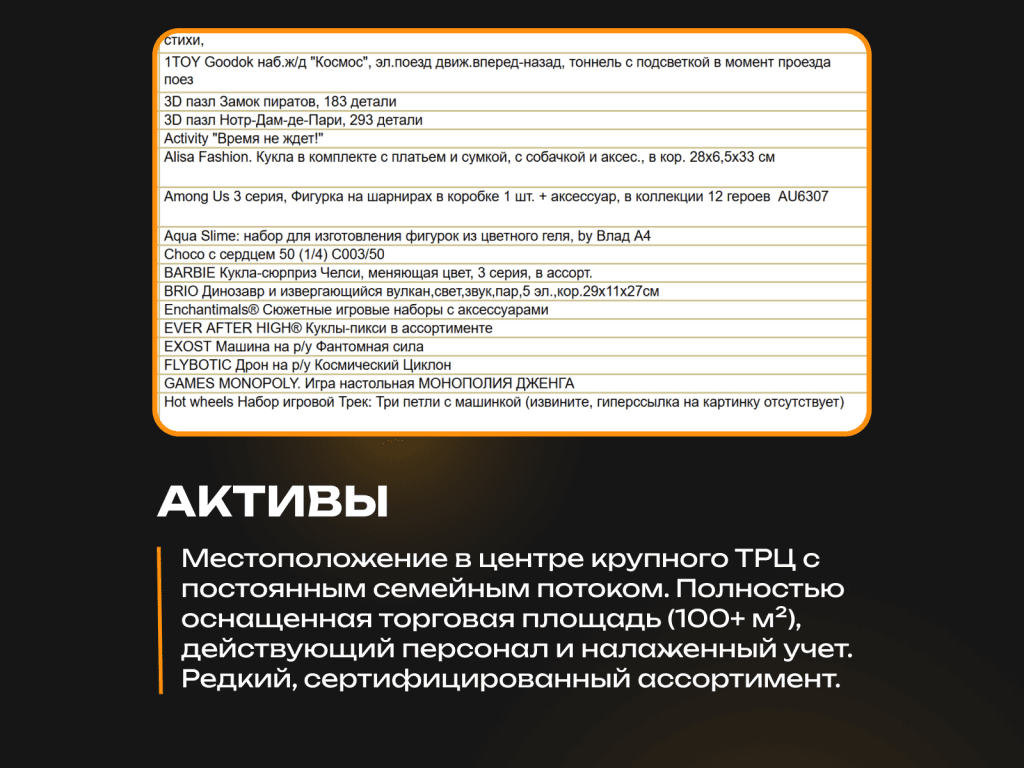— в одном из ключевых ТРЦ с устойчивым семейным трафиком. Рядом расположены кинотеатр, рестораны, детские зоны и игровые пространства — локация отлично подходит для розничного бизнеса такого формата. Средняя чистая прибыль магазина составляет ~98 000 ₽/мес, операционная модель простая и не требует ежедневного контроля собственника.