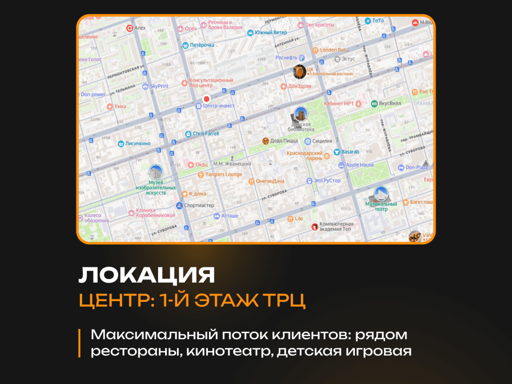 🔸 ТРЦ с высокой проходимостью, особенно среди семейной аудитории (кино + FOOD + детские точки).
