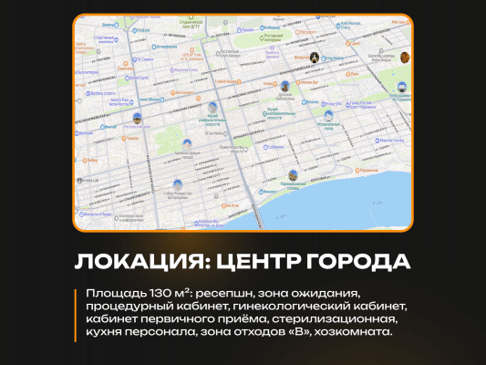 • Площадь 130 м²: ресепшн, зона ожидания, процедурный кабинет, гинекологический кабинет, кабинет первичного приёма, стерилизационная, кухня персонала, зона отходов «В», хозкомната.