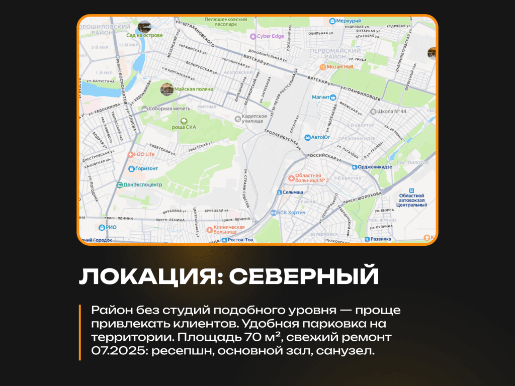 • Район без студий подобного уровня — проще привлекать клиентов.