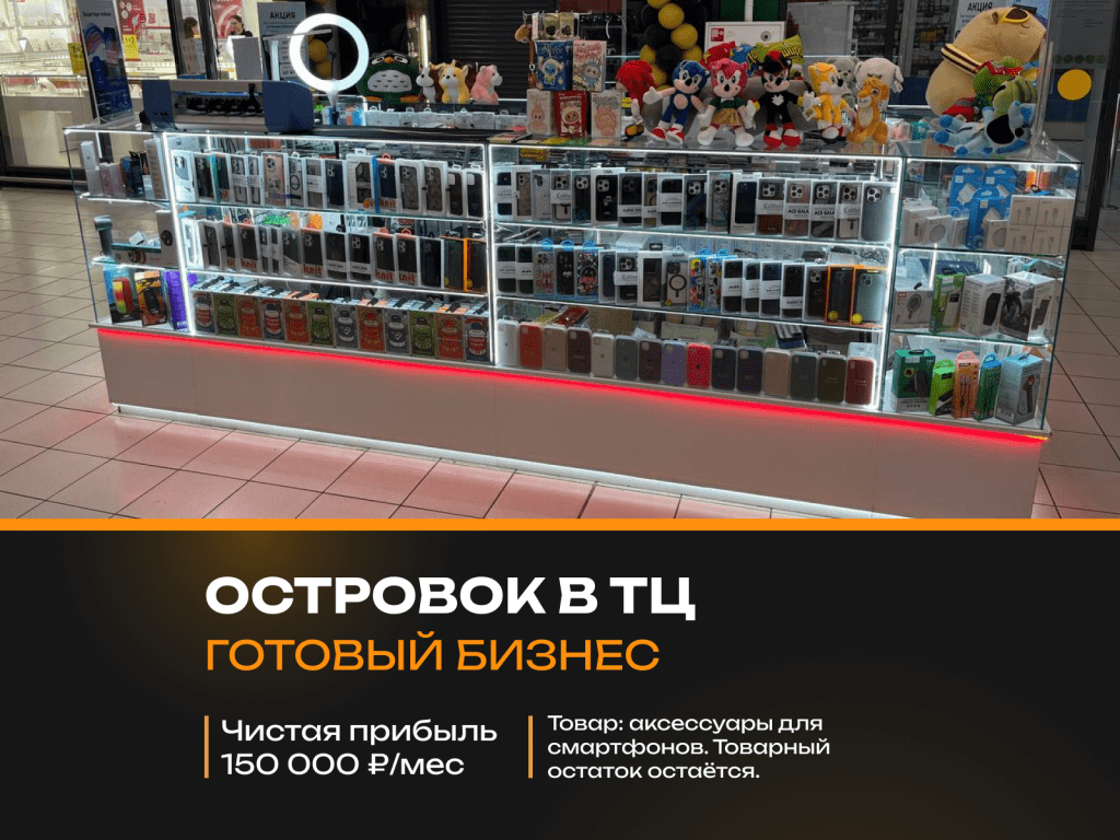 Импульсный офлайн-ритейл с высокой маржинальностью: действующий островок аксессуаров для смартфонов в проходном торговом центре. Компактная площадь ~8 м², стабильный покупательский поток, наценка х5–х15 и чистая прибыль 110–160 тыс. ₽ в месяц. Управление максимально простое — 1 продавец.