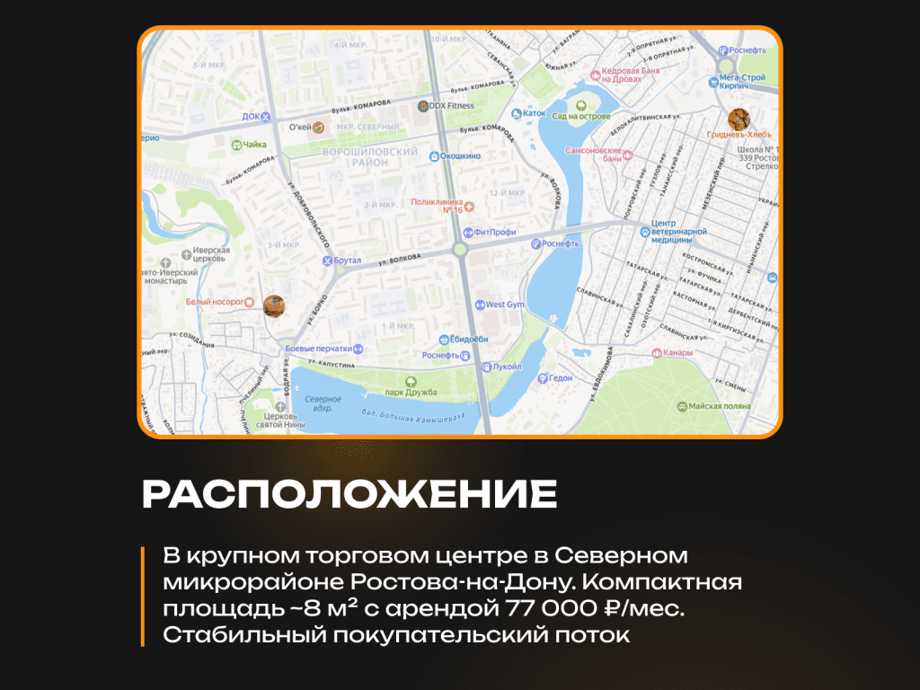 — Локация с офлайн-трафиком ТЦ, прямых конкурентов рядом нет.