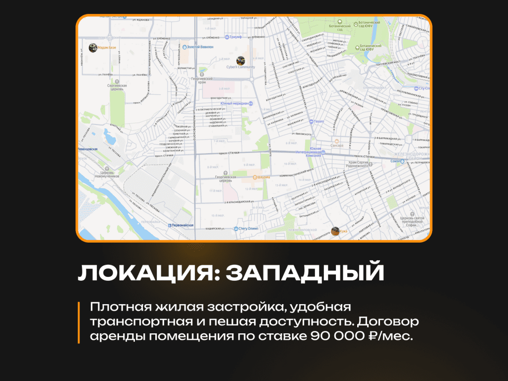 • Локация: район с плотной жилой застройкой и удобной транспортной доступностью между центром и южной частью города.