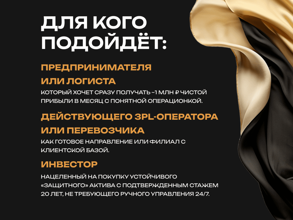 - Действующего 3PL-оператора или перевозчика — как готовое направление или филиал с клиентской базой